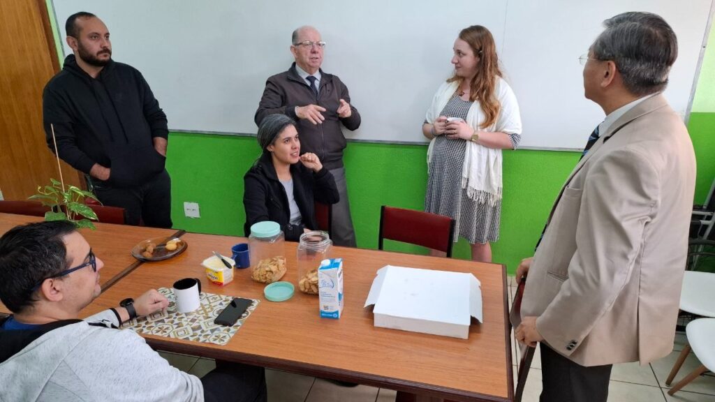Durante o intervalo do Conselho de Classe, alguns professores se encontram no refeitório para um breve café e troca de ideias. Conversaram sobre o Encontro de Gestores, que contou com a participação de representantes de colégios de todo o país, e destacaram a presença de uma docente da escola em uma mesa redonda.Também discutem estratégias para o ensino da matemática, com base em uma palestra recente no IMPA (Instituto de matemática pura e aplicada). A conversa contou com a presença de uma professora visitante, que recolhe elementos para sua dissertação de mestrado.