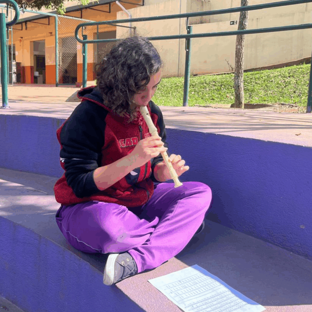 Nos degraus do anfiteatro da escola, envoltos pela sombra suave das árvores, Priscila encontra um refúgio silencioso. Enquanto os colegas, lá no pátio e na quadra, conversam e riem, ela, hoje, optou pelo recolhimento. Com a flauta entre as mãos, seus dedos deslizam com leveza, e as notas de “Ode à Alegria” de Beethoven flutuam no ar.